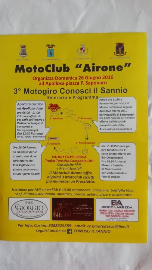 Programma ricco di visite al Museo del Sannio di Benevento, al Castello di Montesarchio. Previste tappe di ristoro, pranzo e cena offerti dal motoclub Airone ed infine 3 prosciutti ai moto club più numerosi. Vi aspettiamo numerosi dalle ore 8.00 ad Apolosa