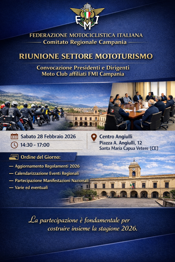 L’incontro è rivolto ai Presidenti e ai Dirigenti dei Moto Club affiliati della Regione Campania e rappresenta un momento fondamentale di confronto, programmazione e condivisione delle linee operative per la stagione 2026.