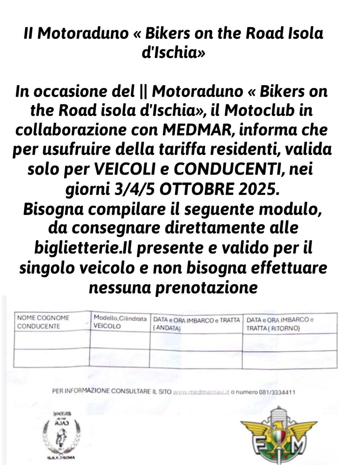 Grazie all’accordo con Medmar, i partecipanti al motoraduno potranno usufruire della tariffa residenti (valida solo per conducenti e veicoli nei giorni 3/4/5 ottobre). Basterà compilare il modulo e consegnarlo in biglietteria.