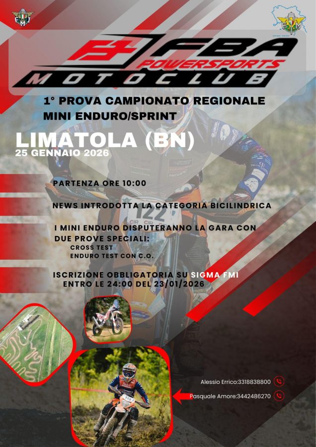 La prima Prova di Campionato Regionale Mini Enduro – Enduro Sprint prevista per domenica 25 Gennaio 2026 sarà organizzata dal MC FBA nel comune di Limatola (BN), come da locandina.