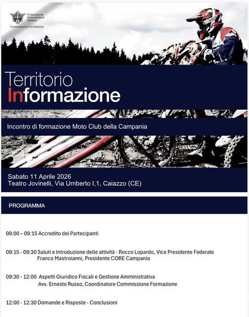 Il progetto nazionale “Territorio InFormazione”, promosso dalla Federazione Motociclistica Italiana, fa finalmente tappa in Campania con due giornate consecutive di confronto e aggiornamento dedicati alla governance associativa. L’appuntamento prenderà il via venerdì 10 aprile 2026 con un incontro formativo riservato al Comitato Regionale FMI Campania, il CORE Campania, che vedrà protagonista l’intero Consiglio Regionale in una sessione pensata per approfondire temi strategici di organizzazione e indirizzo.