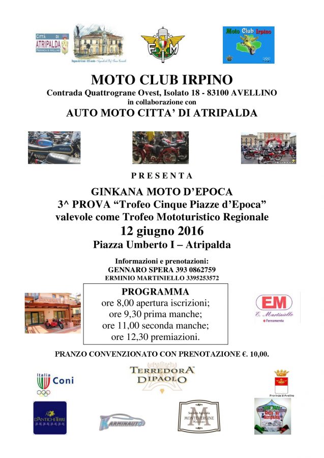 Domenica 12 giugno ad Atripalda il moto club Irpino, in collaborazione con il moto club Nuceria Bikers, organizza la seconda prova del Trofeo “Cinque Piazze d’Epoca”, Gimkana per moto d’epoca e moderne. L’appuntamento sarà valevole anche come seconda prova del Trofeo Mototuristico regionale.